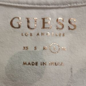 Stylish Guess t-shirt featuring a vibrant floral design. Gold sequined lettering adds a touch of elegance. Perfect for casual wear.