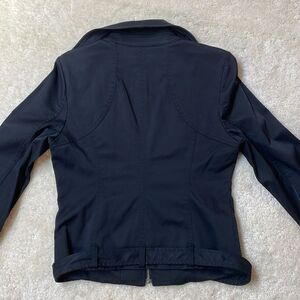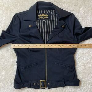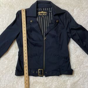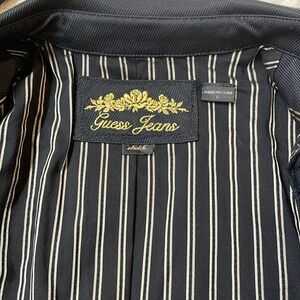 Step up your outerwear style with this chic Guess Jeans belted moto jacket. Crafted from a soft, stretched, black fabric, this jacket features a gold tone front zipper embossed gold button details, and a coordinating belt with a square buckle for a flattering fit. The inside is lined with a black and white striped fabric for a pop of contrast. Perfect for layering over casual or dressy outfits, this versatile piece adds instant edge to your wardrobe. The jacket in my opinion runs small. Please check measurements. Excellent used condition. No stains. No holes or tears. Smoke free home. Fast shipping.