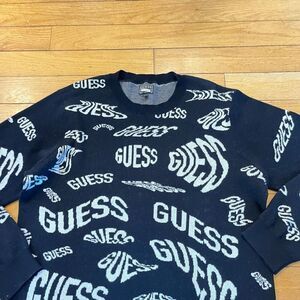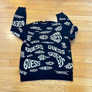 Guess Men's Sweatshirt Black White Large Allover Logo Print Long Sleeve Pullover