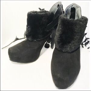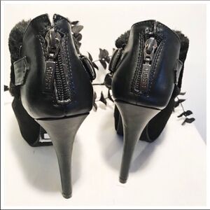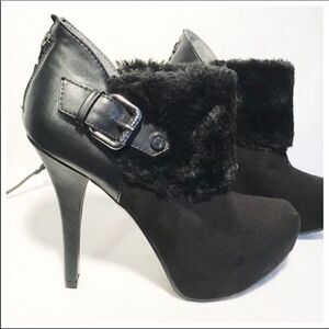 Really awesome pair of black suede Guess ankle booties. Faux fur trim in front of Booties. Strap accent at ankle on both sides. Outer side has shiny silver buckle. 5” heels. Nearly new condition. Small zipper at heel. Small indentation mark on right heel. See third pic