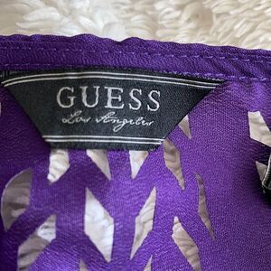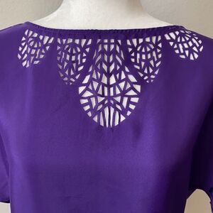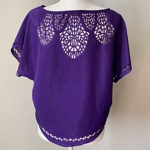 A purple blouse by Guess, excellent condition with no flaws. Laser cut outs around neck, back, bottom hem and sleeves. So pretty! Size XS. 100% polyester.