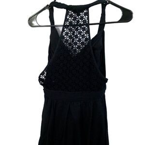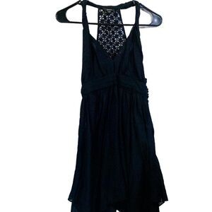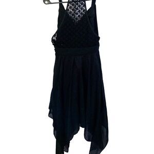 A dress that's chic, flirty, and sexy all in one! Features a low cut triangle top, with a mesh floral back, and a handkerchief skirt.