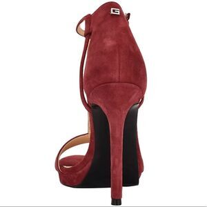Made in a genuine suede leather composition, these open-toe stiletto heels feature a T-strap upper connected to a skinny ankle strap. Buckle closure.