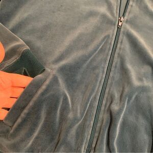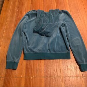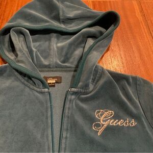 Guess Women’s Teal Blue Velour Hoodie Track Jacket L. Great preowned condition, with the exception of a few small spots. See photos. Approximate measurements armpit to armpit 20 inches length 23 inches.