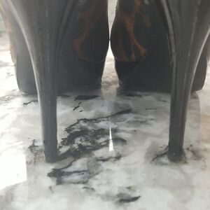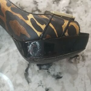Size 7.5, one inch platform and 4.5" heel. Gold tone buckle on front of peep toe. Super comfortable. Please see the last bunch of photos. These are well-loved but the blemishes are not noticeable when worn. These flaws are reflected in the price.
