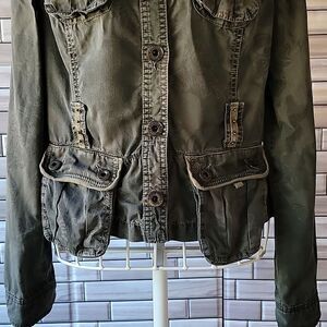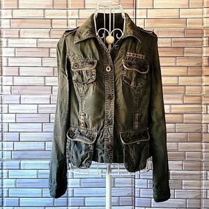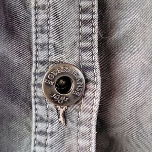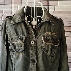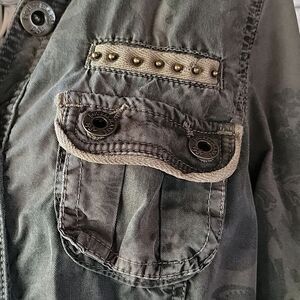 Guess original floral camoflouge shirt jacket made of 100% lyocell, a durable and comfy lightweight all natural material. A stunning amount of detail on this jacket. 4 flap pockets with bronze rivet closures, pointed collar and roll-up sleeves. Beautiful! Great pre-owned condition