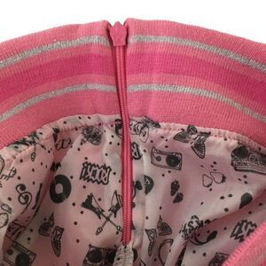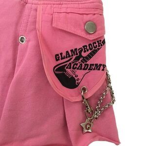 Little girl pink skirt with Guess logo on back of skirt. Small pocket on front with snap. Silver chain that goes from pocket and extend to right hip. Glam Rock Academy is written by small pocket. Lace hem falls below the skirt all around the skirt, Zipper in back.