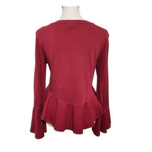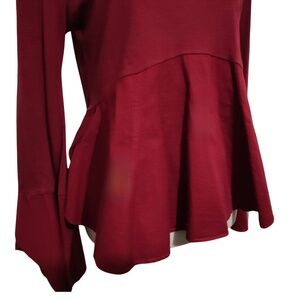Guest Editor. Maroon peplum top. Knit. Long bell sleeves. Scoop neck. Size small.