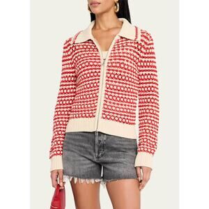 Guest in Residence “Kirby” crochet-knit jacket featuring contrasting trim, spread collar, long sleeves, hip length, ribbed cuffs and hem, two-way front zip closure, and crafted from a cotton, nylon, and polyamide blend.