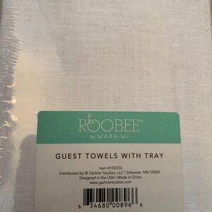 ROOBEE by MARI-MI lovely disposable white floral design with greenish-blue background guest towels in tray. Great for special occasions baby or bridal shower, dinner, bath, kitchen, or guest room. One box of 32 count (3-PLY) paper napkins 13 in x 15.8 in when unfolded. Linen look paper tray.