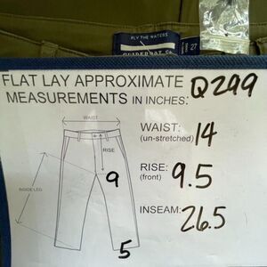 Tag size 27, flat lay approx. measurements: Waist 14", Rise 9.5", Inseam 26.5"
