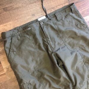 Guides Choice zip off hiking pants with lots of pockets. Size 12 Preowned condition. Bottom of back leg is worn where it was a little to long for me. See pictures. A tiny hole on front pocket and a few pulls see picture. Some imperfections but still good hiking pants. Olive/army green color. Can be buttoned up to Capri’s also