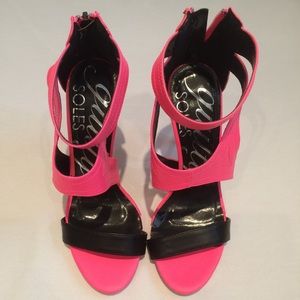 Guilty Soles hot pink & black strappy heels size 7. Only worn once. Back zipper. Last pic shows scuff marks on right heel and small glue dot on left ankle strap. Approx heel shaft 4.5". Stunners!!