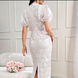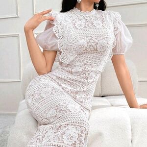 Guipure Lace Puff Sleeve Split Back Dress Long Evening Dresses