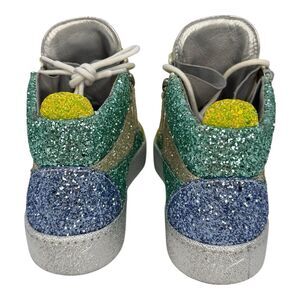 The product is a stylish and colorful Giuseppe Zanotti Kriss Glitter High Top sneaker in size Italy 41, which translates to a US size 8. This unisex athletic shoe features a comfortable rubber outsole and leather lining material, making it suitable for casual occasions in all seasons. With glitter accents and a high-top shaft style, these sneakers are perfect for those looking to add a touch of designer flair to their footwear collection. Made in Italy, the shoe is a combination of functionality and fashion, ideal for walking and everyday wear.