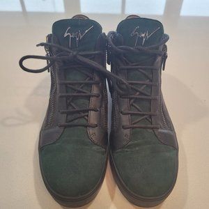 These mid-top sneakers, made from forest green velvet and black patent leather, feature matching cotton laces, a metal Signature detail on the tongue and matching zip fastening at the sides. The black rubber sole gives this shoe's design the perfect finish.