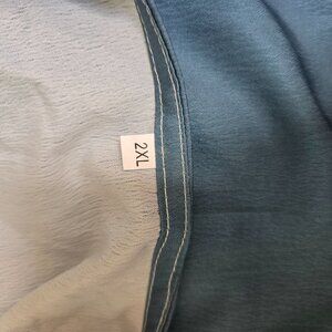 Cute over shirt in a teal like blue with electric guitar playing cat about 27 in Long and 24 in underarm to underarm laid flat. Polyester. Because it doesn't stretch it's definitely an XL..