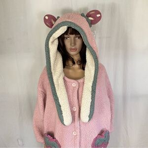 Gukoo pink plush strawberry hooded ears buttons front pajama robe L