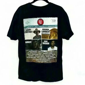 Keywords: Gulf Coast Jam, concert t-shirt, music tee, unisex, black graphic tee, Kenny Chesney, Miranda Lambert, Hardy, Kane Brown, summer fashion, casual wear, heavy cotton, machine washable, pre-owned.