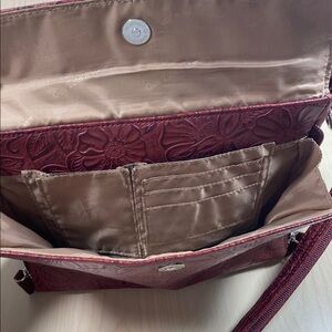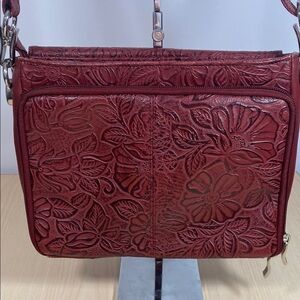 This crossbody bag features a rich red hue and an elegant embossed floral pattern, crafted from high-quality leather. Its adjustable strap and classic design make it a versatile accessory for any occasion.