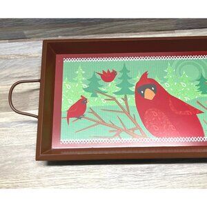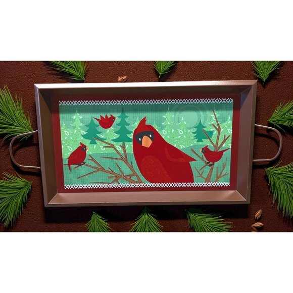 Decorative serving tray featuring a festive cardinal design with durable handles. Perfect for holiday entertaining, serving refreshments, or as seasonal décor.