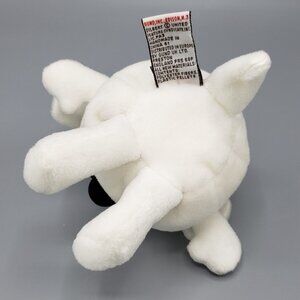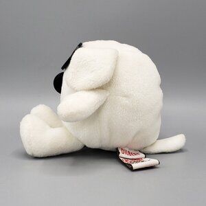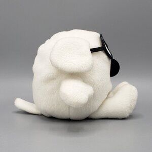 Bean bag plush featuring the Dogbert character from the Dilbert comic strip series created by Scott Adams. It was made by Gund and contains polyester fibers and plastic pellets. The dog is white, with a black nose and black-rimmed plastic glasses attached to the face. This mini stuffed animal toy is approximately 4" tall when seated.