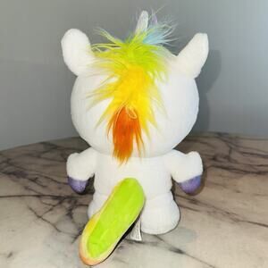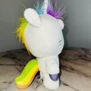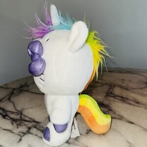 This plush features Hello Kitty dressed as a unicorn with a fluffy, colorful mane and a sparkly horn.