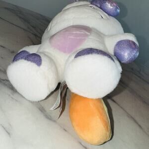 It has a sparkly purple bow and matching hooves.