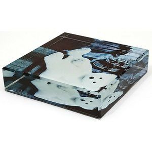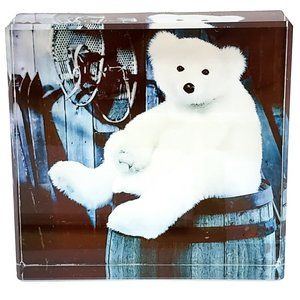 Clear glass square with black & white picture of white teddy bear. Made in China.