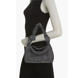 Faceted crystals lend shine to a mesh shoulder bag with knotted details and a soft satin lining. Color gunmetal