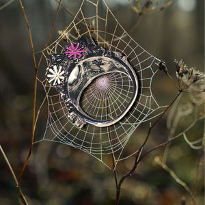 Dark Gunmetal Gray Spider cages with legs a Large Blue Oval Crystal, Pink Crystals, Multicolor Enamel Flowers. Approx measurements 3/4" wide x 1 1/8" across x 3/8" high. 2mm shank, size 10