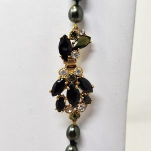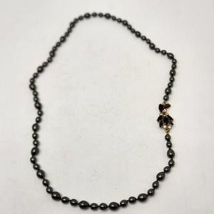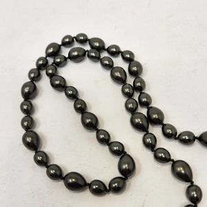 Gunmetal Gray Glass Bead Strand Long Necklace Black Rhinestone Clasp Hand Knot