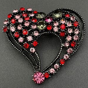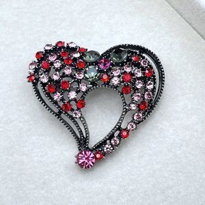 Gun Metal Grey Black Tone Open Heart Pin Back Brooch Embellished with Ruby Red, Light and Dark Pink Sapphire and Olivine Green Crystals