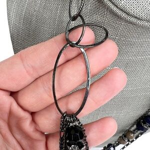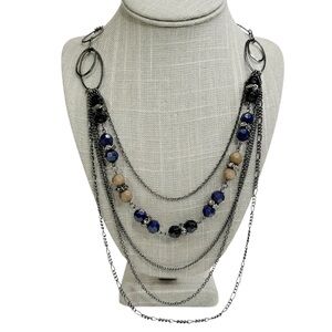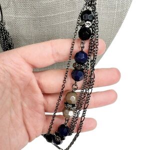 Gunmetal Multi-Layered Chain Acrylic Faceted Blue, Black & Brown Beaded Necklace. In gently preowned condition with one small nick to one of the beads (see circled pic) and light wear to the clasp. Gunmetal gray multi-layered necklace with different types of chains. Features acrylic blue, black and brown faceted beads. Lobster claw closure with extender. Unbranded. No precious metals or gems.