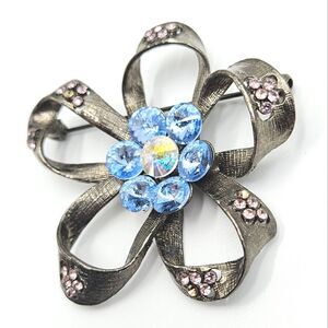 Whimsical Gunmetal Ribbon Flower with Pink and Blue Rhinestone Flower Pin Brooch