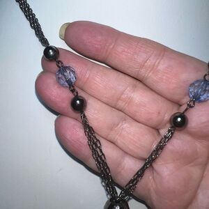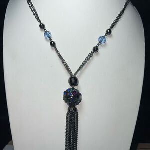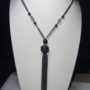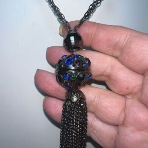 Gunmetal and Crystal Long Fringe Statement Necklace