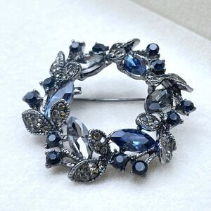 Gunmetal with Gray and Blue Sapphire Crystal Floral Leaf Wreath Pin Back Brooch