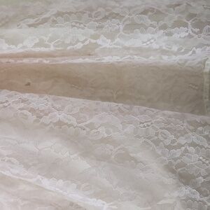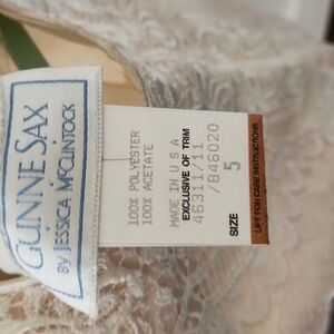 Gunne Sax label photographed on cream lace fabric. Blue brand logo on woven tag. Delicate lace texture visible around tag. some sign of age. over all really nice condition. needs cleaned.