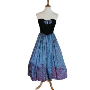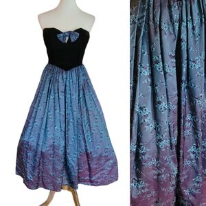 Gunne Sax 80's Velvet and Iridescent Satin Floral Strapless Ankle Length Gown