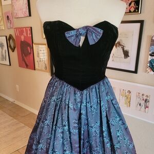 Excellent pre owned condition. Gunne Sax Velvet and Iridescent Satin Floral Strapless Ankle Length Gown. Sweetheart neckline. Bow accent. Iridescent floral skirt. Full crinoline underlay. Back zipper. Flatlay Pit to pit 13.5" Waist 14" Shoulder to hem 40" Minor wear