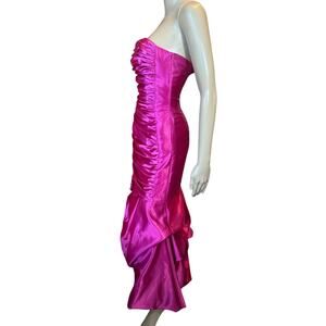 Gunne Sax Barbie Core Fuchsia Pink Taffeta Satin Ruched Bubble Hem Evening Asymmetrical Sheath Gown Size 1 Jessica McClintock Vintage 80s 90s Formal Dress