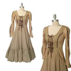 Vintage 70s Gunne Sax fit and flare midi dress in tan corduroy and ditsy floral calico with plaid ribbon details. Bodice and back are quilted, front ties shut. In gently preowned condition, there are some loose stitches along the pockets and on the lower bodice, no other flaws noted. Estimated Gunnies size 7, see measurements for best modern fit.