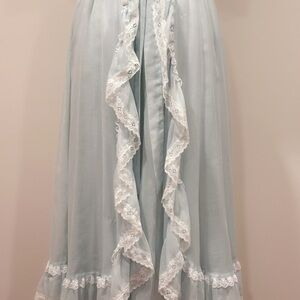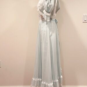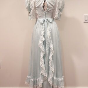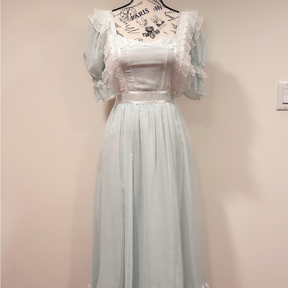 Vintage Gold Label Gunne Sax. Label was cut, authenticity was verified by the expert Gunne Sax group. This dress is stunning! And I’ve not found another like it. This powder blue Gunny features appliqué at the neckline, Swiss dot ruffled lace on the bodice, puff sleeves and a split ruffled back on the skirt paying homage to the Victorian bustle. The delicate details in this dress create the softest romantic look.