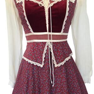 Gunne Sax Peplum Midi Dress Size 9 Burgundy Floral Calico Velvet Corset 70s VTG