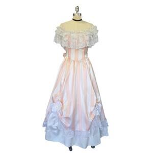 Vintage 1980's Gunne Sax white and pink satin stripe Southern belle style princess dress with basque waist, lace neckline and gathered skirt. Lace sleeves can be worn on or off the shoulder. Gunnies size 9, see measurements for best modern fit. Fits size 4 dress form. Gently preowned condition, there are some light marks on the material, see photos. Missing one decorative bow on skirt. Very full skirt with tulle underskirt. White layer has been reversibly hemmed, can be let out. Measurements are approximate, lying flat.