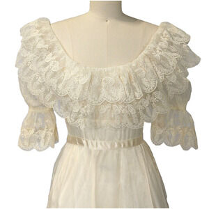 Vintage 1970's Gunne Sax Romantic Renaissance Bridal Collection tulle and lace over ivory satin maxi dress with lace puff sleeves and elastic peasant style neckline that can be worn on or off the shoulder. Gunnies size 7, more like a 9, fits size 4 dress form and size 4 model perfectly. In gently preowned condition, very faint mark on tulle as shown in photos, not colorfast, should come out with drycleaning. Zip back, satin tie back waist. Measurements are approximate, lying flat.