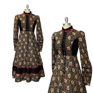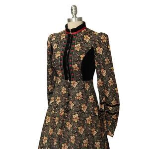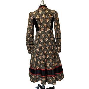 Vintage 70s Gunne Sax Russian Doll midi dress in black boho floral print with velvet insets, button front bodice, mock neck, button-up front, long sleeves with two button cuffs, full skirt, and 2 side pockets. In gently preowned condition, the top button has been replaced, the dress has been hemmed, and the ribbon along the satin tier has been reattached at a few spots, see photos. Colors are bright and material is still very crisp. No other flaws noted. Missing original belt. Gunnies size 9, see measurements for best modern fit.