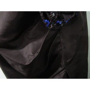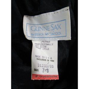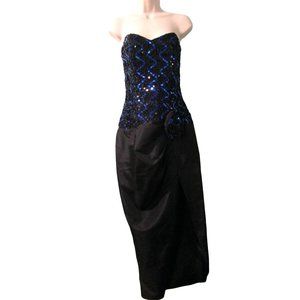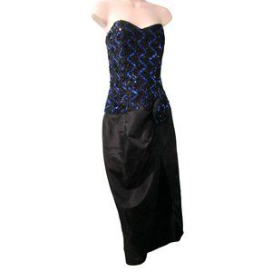 Vintage Gunne Sax Sequin Taffeta Rosette Strapless Cocktail Dress in viintage size 7/8. This stunning blue and black dress features a tulip skirt and a strapless design, perfect for any special occasion. Vintage 1980 Jessica McClintock Gunne Sax. Asymmetrical tulip skirt had side slit and curved hem. Strapless bodice has sig zag blue and black sequins with black ribbon soutache trim. Bodice has boning. Ships in a box. Has loose sequins, loose soutache. Vintage Size, Please See Measurements As Garment May Have Shrunk Over Time and Vintage Sizing Differs From Modern.