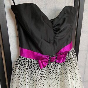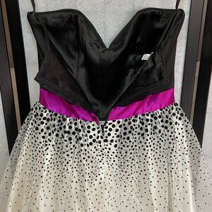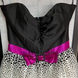 Vintage Strapless Short Prom Formal Dress from Jessica McClintock for Gunne Sax. Lovingly worn, not torn or stained – looks in excellent condition. Dry Cleaning tag still attached. Fit and flare silhouette. Black satin bodice, bright magenta waistband accented with large, jeweled bow. Shirred center front forms sweetheart neckline. White skirt with black dotted netting overlay. Dots become smaller and sparser towards hem. There are some dots with sparkles for even more splash. Skirt is fully lined. Another layer has built in petticoat with a ruffled net double flounce at hem for added twirl. Back zip with hook and eye closure. Estimate to be from 1980's maybe 90's, definitely after the 70's prairie style Gunne Sax era. Perfect for prom, homecoming, weddings, garden parties, or any formal event, this dress delivers timeless style with a magical, vintage flair.