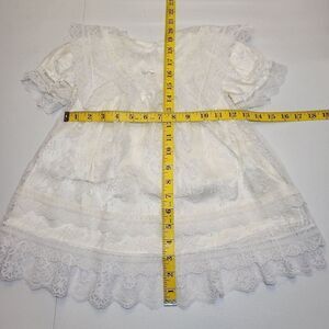 Charming white lace dress set with intricate floral patterns. Features delicate lace trim and short sleeves.